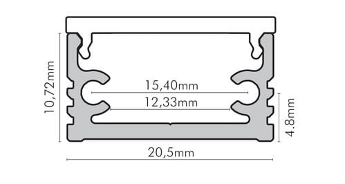 ** Caratteristiche generali ** Composto da: -n. 1 profilo di alluminio da 2m, -n. 1 copertura da 2m ** Caratteristiche Elettriche ** Potenza dissipabile (35°C): 19W/m ** Caratteristiche Meccaniche ** Lunghezza profilo: 2m Larghezza: 20mm Larghezza interna: 12.33mm Altezza: 11mm Grado di protezione: IP20 Materiale corpo: Alluminio Colore corpo: Naturale Diffusore: Policarbonato opaco ** Attenzione ** La copertura in PMMA è più resistente alle temperature e ai raggi UV rispetto alla copertura in Policarbonato (PC). Il profilo illustrato è un componente. Il suo corretto funzionamento con nastri led o moduli led dipende da importanti requisiti di installazione e dimensionamento. La potenza dissipabile è stata calcolata considerando una temperatura ambiente non superiore a 35°C in aria. Condizioni di installazione differenti devono essere opportunamente verificate da personale tecnico. Utilizzare la copertura solo con nastri led IP20. Alpha Elettronica declina ogni responsabilità per danni o malfunzionamenti derivati da un uso inappropriato del profilo.