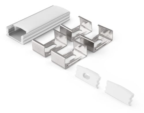 ** Caratteristiche generali ** Kit composto da: -n. 1 profilo di alluminio da 2m, -n. 1 copertura da 2m -n. 2 terminali di chiusura in plastica -n. 4 graffette di fissaggio ** Caratteristiche Elettriche ** Potenza dissipabile (35°C): 15W/m ** Caratteristiche Meccaniche ** Lunghezza profilo: 2m Larghezza: 17.5mm Larghezza interna: 12.2mm Altezza: 7mm Peso alluminio al metro: 121g/m Peso cover al metro: 31g/m Materiale corpo: Alluminio anodizzato Colore corpo: Naturale Diffusore: Policarbonato opaco **Attenzione ** La copertura in Policarbonato (PC) è più sensibile alle temperature e ai raggi UV rispetto alla copertura in PMMA. Il profilo illustrato è un componente. Il suo corretto funzionamento con nastri led o moduli led dipende da importanti requisiti di installazione e dimensionamento. La potenza dissipabile è stata calcolata considerando una temperatura ambiente non superiore a 35°C in aria. Condizioni di installazione differenti devono essere opportunamente verificate da personale tecnico. Utilizzare la copertura solo con nastri led IP20. Alpha Elettronica declina ogni responsabilità per danni o malfunzionamenti derivati da un uso inappropriato del profilo.