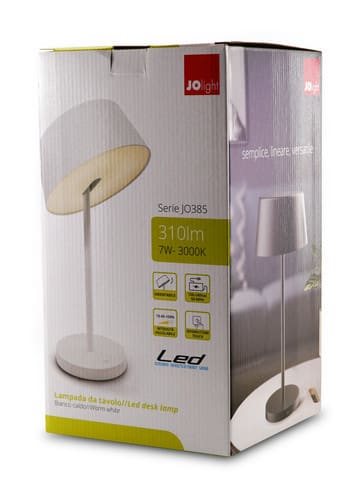 ** Descrizione: ** Lampade da tavolo JOlight da 7W in plastica con interruttore touch. Design semplice ma elegante. Intensità della luce regolabile tramite interruttore touch: 10% - 45% - 100%. Non collegabile a dimmer esterni. ** Caratteristiche Generali ** Alimentazione: Alimentatore esterno Tempo di vita L70B50: 25000h Numero cicli di accensione: 15000 cicli Rischio fotobiologico: Esente ** Caratteristiche di Illuminazione ** Colore: Bianco caldo Flusso: 310lm CRI: 80 ** Caratteristiche Elettriche ** Potenza: 7W Fattore di potenza PF: 0.4 Tens. funzionamento AC: 230Vac (100‑240Vac) Frequenza: 50-60Hz Dimmerabile: no Classe isolamento: II Alimentatore: Esterno (incluso) ** Caratteristiche Sorgente Luminosa ** Tensione Led: 10.6Vdc Corrente Led: 500mA Tipo Alimentazione: Corrente Costante Temp. Colore: 3000K ** Caratteristiche Meccaniche ** Altezza: 336mm Diametro: ø125mm Materiale corpo: Plastica Colore corpo: Nero Diffusore: Plastica ** Caratteristiche Termiche ** Temp. di funzionamento: 0/ 30°C Alimentatore esterno incluso: Corrente costante 500mA 12V max
