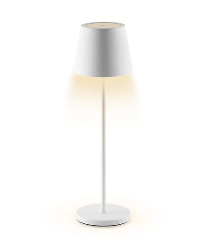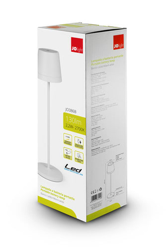 Lampada da tavolo a LED a batteria. Interruttore Touch illuminato nella parte superiore. Emissione di luce calda verso il basso. La lampada integra una batteria agli ioni di litio per una durata della carica maggiore. Disponibile in versione bianca, nera, corten e verde. Intensità luminosa regolabile (0-100%) tramite pulsante touch. Incluso cavo USB da tipo C a tipo A per collegamento al caricabatteria. ** Caratteristiche Generali ** Alimentazione: A batteria Tempo di vita L70B50: 25000h Numero cicli diaccensione: 15000 cicli Rischio fotobiologico: Esente ** Caratteristiche di Illuminazione ** Colore: Bianco caldo Flusso: 130lm CRI: 95 ** Caratteristiche Elettriche ** Potenza: 2.2W Alimentatore: Esterno (non incluso) ** Caratteristiche Sorgente Luminosa ** Tensione Led: 3Vdc Corrente Led: 380mA Tipo Alimentazione: Corrente Costante Temp. Colore: 2700K ** Caratteristiche Meccaniche ** Altezza: 385mm Diametro: ø110mm Grado di protezione: IP54 Materiale corpo: Plastica Colore corpo: Bianco Diffusore: Vetro trasparente ** Caratteristiche Termiche ** Temp. di funzionamento: 0 / 30°C ** Caratteristiche Batteria ** Pacco batteria incluso: 2x2500mAh Li-Ion 18650 Durata: 10h (100% luminosità), 20h (50% luminosità) Tempo di ricarica: 5h (5Vdc 2A) ** Contenuto confezione: ** - Lampada a batteria portatile; - Cavo USB C - USB A 1m; - Istruzioni Nota: caricabatteria consigliato (non incluso) 5Vdc 2,1A.