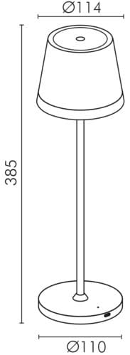Lampada da tavolo a LED a batteria. Interruttore Touch illuminato nella parte superiore. Emissione di luce calda verso il basso. La lampada integra una batteria agli ioni di litio per una durata della carica maggiore. Disponibile in versione bianca, nera, corten e verde. Intensità luminosa regolabile (0-100%) tramite pulsante touch. Incluso cavo USB da tipo C a tipo A per collegamento al caricabatteria. ** Caratteristiche Generali ** Alimentazione: A batteria Tempo di vita L70B50: 25000h Numero cicli diaccensione: 15000 cicli Rischio fotobiologico: Esente ** Caratteristiche di Illuminazione ** Colore: Bianco caldo Flusso: 130lm CRI: 95 ** Caratteristiche Elettriche ** Potenza: 2.2W Alimentatore: Esterno (non incluso) ** Caratteristiche Sorgente Luminosa ** Tensione Led: 3Vdc Corrente Led: 380mA Tipo Alimentazione: Corrente Costante Temp. Colore: 2700K ** Caratteristiche Meccaniche ** Altezza: 385mm Diametro: ø110mm Grado di protezione: IP54 Materiale corpo: Plastica Colore corpo: Corten Diffusore: Vetro trasparente ** Caratteristiche Termiche ** Temp. di funzionamento: 0 / 30°C ** Caratteristiche Batteria ** Pacco batteria incluso: 2x2500mAh Li-Ion 18650 Durata: 10h (100% luminosità), 20h (50% luminosità) Tempo di ricarica: 5h (5Vdc 2A) ** Contenuto confezione: ** - Lampada a batteria portatile; - Cavo USB C - USB A 1m; - Istruzioni Nota: caricabatteria consigliato (non incluso) 5Vdc 2,1A.