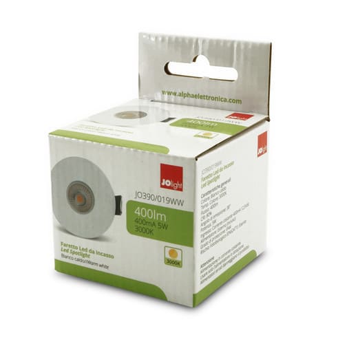 ** Caratteristiche Generali ** Tempo di vita L70B50: 30000h Numero cicli di accensione: 15000 cicli Tipo di led: Bridgelux Numero Led: 1 Rischio fotobiologico: Esente ** Caratteristiche di Illuminazione ** Colore: Bianco caldo Flusso: 300lm CRI: 80 Angolo di emissione: 50° Starting time: 0.2s ** Caratteristiche Elettriche ** Potenza: 4.8W Fattore di potenza PF: 0.5 Corrente ingresso max: 70mA Tens. funzionamento AC: 230Vac Tolleranza d'ingresso: ±10% Frequenza: 50Hz Dimmerabile: no Classe isolamento: II Alimentatore: Esterno (incluso) ** Caratteristiche Sorgente Luminosa ** Tensione Led: 9Vdc Corrente Led: 350mA Tipo Alimentazione: Corrente Costante Temp. Colore: 3000K ** Caratteristiche Meccaniche ** Altezza: 39mm Diametro: ø54mm Fissaggio: Incasso con clip Montaggio: Incasso Foro incasso: ø45mm Grado di protezione: IP44 Materiale corpo: Alluminio verniciato Colore corpo: Bianco Cornice: Alluminio verniciato Diffusore: PMMA trasp. Connessioni: Connettori e cavetti inclusi Lunghezza cavo: 0.4m Orientabile: no ** Caratteristiche Termiche ** Temp. di funzionamento: -10 / 40°C ** Attenzione ** Alimentazione in corrente costante. Usare solo l'alimentatore in dotazione. Alimentatori errati danneggiano il prodotto.
