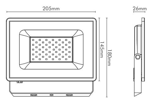 ** Caratteristiche Generali ** Tempo di vita L70B50: 30000h Numero cicli di accensione: 15000 cicli Rischio fotobiologico: Esente ** Caratteristiche di Illuminazione ** Colore: Bianco naturale Flusso: 4320lm CRI: 80 Angolo di emissione: 105° Starting time: 0.2s ** Caratteristiche Elettriche ** Potenza: 50W Fattore di potenza PF: 0.9 Corrente ingresso max: 217mA Tens. funzionamento AC: 230Vac Tolleranza d'ingresso: ±10% Frequenza: 50Hz Dimmerabile: no Classe isolamento: I Alimentatore: Integrato ** Caratteristiche Sorgente Luminosa ** Temp. Colore: 4000K ** Caratteristiche Meccaniche ** Lunghezza: 26mm Larghezza: 205mm Altezza: 145mm Fissaggio: Staffe Incluse Montaggio: A parete Grado di protezione: IP65 Materiale corpo: Alluminio verniciato Colore corpo: Bianco Diffusore: Vetro temprato Lente: Nessuna Connessioni: Cavo libero Tipologia cavo: H05RNF Lunghezza cavo: 0.3m Orientabile: si ** Caratteristiche Termiche ** Temp. di funzionamento: -10 / 40°C