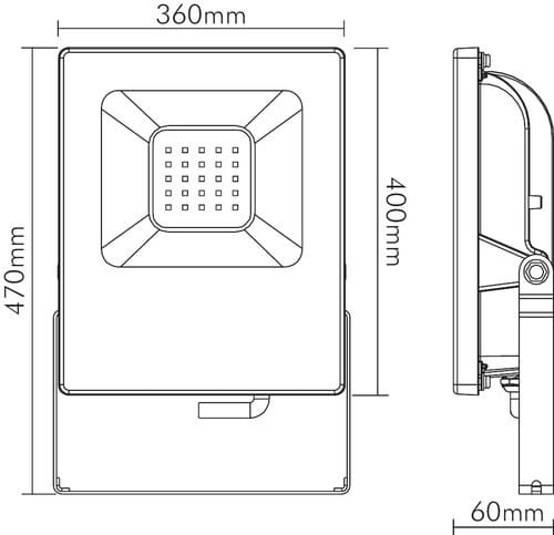 ** Caratteristiche Generali ** Tempo di vita L70B50: 30000h Numero cicli di accensione: 15000 cicli Rischio fotobiologico: Esente ** Caratteristiche di Illuminazione ** Colore: Bianco naturale Flusso: 20000lm CRI: 80 Angolo di emissione: 120° Starting time: 0.5s ** Caratteristiche Elettriche ** Potenza: 200W Tens. funzionamento AC: 230Vac Tolleranza d'ingresso: ±10% Frequenza: 50Hz Dimmerabile: no Classe isolamento: I Alimentatore: Integrato ** Caratteristiche Sorgente Luminosa ** Temp. Colore: 4000K ** Caratteristiche Meccaniche ** Lunghezza: 60mm Larghezza: 360mm Altezza: 470mm Fissaggio: Staffe Incluse Montaggio: A parete Grado di protezione: IP65 Materiale corpo: Alluminio verniciato Colore corpo: Nero Diffusore: Vetro satinato Connessioni: Cavo libero Tipologia cavo: H05RNF Lunghezza cavo: 0.5m ** Caratteristiche Termiche ** Temp. di funzionamento: -20 / 40°C