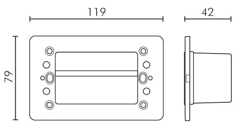 ** Caratteristiche Generali ** Tempo di vita L70B50: 20000h Numero cicli di accensione: 15000 cicli Tipo di led: COB Numero Led: 1 Rischio fotobiologico: Esente ** Caratteristiche di Illuminazione ** Colore: Bianco caldo Flusso: 150lm CRI: 90 Angolo di emissione: 80° ** Caratteristiche Elettriche ** Potenza: 2W Tens. funzionamento AC: 230Vac Tolleranza d'ingresso: ±10% Frequenza: 50-60Hz Dimmerabile: no Classe isolamento: II Alimentatore: Integrato ** Caratteristiche Sorgente Luminosa ** Temp. Colore:3000K ** Caratteristiche Meccaniche ** Lunghezza: 42mm Larghezza: 119mm Altezza: 79mm Fissaggio: Tramite viti Montaggio: A parete, Incasso Grado di protezione: IP65 Materiale corpo: Plastica Colore corpo: Nero Diffusore: Plastica Connessioni: Cavo libero Lunghezza cavo: 0.2m Orientabile: no ** Caratteristiche Termiche ** Temp. di funzionamento: -10 / 40°C