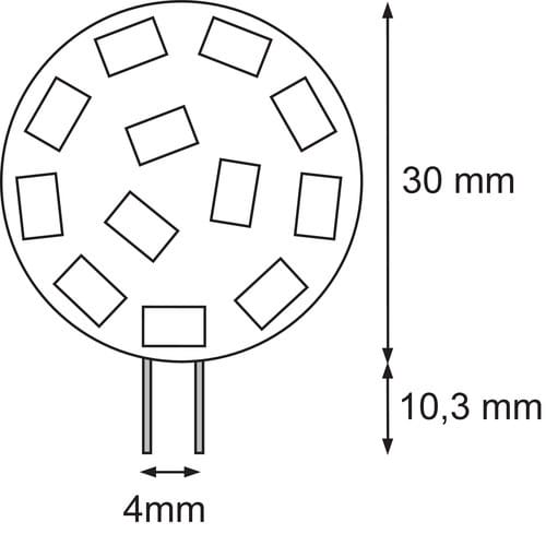 ** Caratteristiche Generali ** Tempo di vita L70B50: 20000h Numero cicli di accensione: 10000 cicli Fattore di sopravvivenza: 0.9 Tipo di led: smd 2835 Numero Led: 10 Rischio fotobiologico: Esente ** Caratteristiche di Illuminazione ** Colore: Bianco caldo Flusso: 195lm CRI: 80 Angolo di emissione: 120° Starting time: 0.2s Fattore mantenimento flusso: 0.96 Uniformità colore (SDCM): 6 ** Caratteristiche Elettriche ** Classe energetica: E Potenza: 1.5W Tens. funzionamento DC: 12Vdc (10‑30Vdc) Tens.funzionamento AC: 12Vac (8‑15Vac) Frequenza: 50-60Hz Dimmerabile: no ** Caratteristiche Sorgente Luminosa ** Temp. Colore: 3000K ** Caratteristiche Meccaniche ** Attacco: G4 Lunghezza: 9mm Larghezza: 30mm Altezza: 40mm Diametro: ø30mm ** Caratteristiche Termiche ** Temp. di funzionamento: -10 / 40°C ** Attenzione ** Non utilizzare con dimmer o trasformatori elettronici.