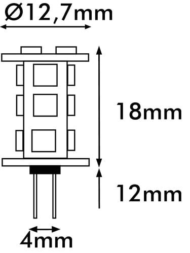 ** Caratteristiche Generali ** Tempo di vita L70B50: 20000h Numero cicli di accensione: 10000 cicli Fattore di sopravvivenza: 0.9 Tipo di led: smd 3014 Numero Led: 15 Rischio fotobiologico: Esente ** Caratteristiche di Illuminazione ** Colore: Bianco caldo Flusso: 160lm CRI: 80 Angolo di emissione: 360° Starting time: 0.2s Fattore mantenimento flusso: 0.96 Uniformità colore (SDCM): 6 ** Caratteristiche Elettriche ** Classe energetica: F Potenza: 1.5W Tens. funzionamento DC: 12Vdc (10‑30Vdc) Tens.funzionamento AC: 12Vac (8‑15Vac) Frequenza: 50-60Hz Dimmerabile: no ** Caratteristiche Sorgente Luminosa ** Temp. Colore: 3000K ** Caratteristiche Meccaniche ** Attacco: G4 Lunghezza: 30mm Larghezza: 13mm Altezza: 13mm Diametro: ø12.7mm ** Caratteristiche Termiche ** Temp. di funzionamento: -10 / 40°C ** Attenzione ** Non utilizzare con dimmer o trasformatori elettronici.