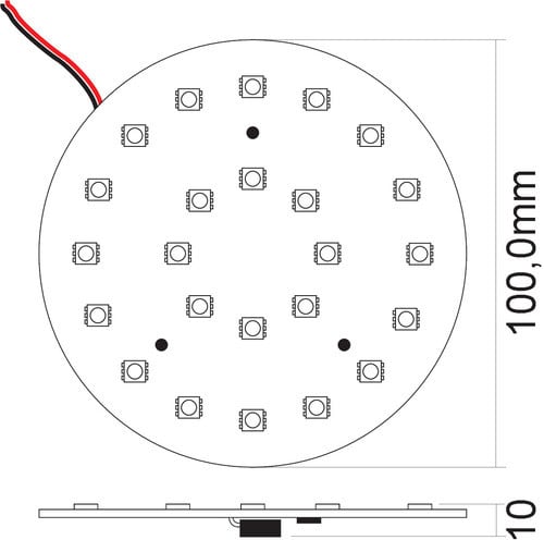 ** Caratteristiche Generali ** Tempo di vita L70B50: 20000h Numero cicli di accensione: 10000 cicli Fattore di sopravvivenza: 0.9 Tipo di led: smd 2835 Numero Led: 24 Rischio fotobiologico: Esente ** Caratteristiche di Illuminazione ** Colore: Bianco freddo Flusso: 550lm CRI: 80 Angolo di emissione: 120° Starting time: 0.2s Fattore mantenimento flusso: 0.96 Uniformità colore (SDCM): 6 ** Caratteristiche Elettriche ** Classe energetica: F Potenza: 5W Tens. funzionamento DC: 12Vdc (10‑30Vdc) Dimmerabile: no ** Caratteristiche Sorgente Luminosa ** Temp. Colore: 6000K ** Caratteristiche Meccaniche ** Attacco: Cavetto Lunghezza: 100mm Larghezza: 100mm Altezza: 10mm Diametro: ø100mm ** Caratteristiche Termiche ** Temp. di funzionamento: -10 / 40°C ** Attenzione ** Non utilizzare con dimmer o trasformatori elettronici.