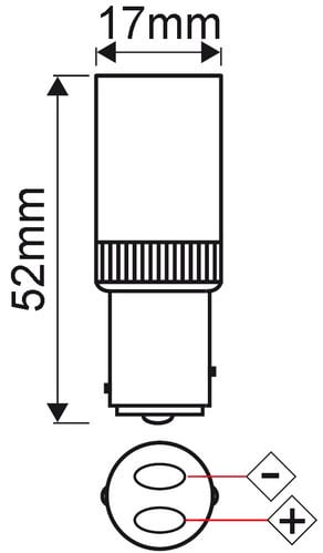 ** Caratteristiche Generali ** Tempo di vita L70B50: 20000h Numero cicli di accensione: 10000 cicli Fattore di sopravvivenza: 0.9 Tipo di led: smd 2835 Numero Led: 51 Rischio fotobiologico: Esente ** Caratteristiche di Illuminazione ** Colore: Bianco naturale Flusso: 290lm CRI: 80 Angolo di emissione: 360° Starting time: 0.1s Fattore mantenimento flusso: 0.95 Uniformità colore (SDCM): 6 ** Caratteristiche Elettriche ** Classe energetica: F Potenza: 3W Tens. funzionamento DC: 10‑30Vdc Tens. funzionamento AC: 24Vac Frequenza: 50Hz/20KHz Dimmerabile: no ** Caratteristiche Sorgente Luminosa ** Temp. Colore: 4000K ** Caratteristiche Meccaniche ** Attacco: BAY15d Lunghezza: 17mm Larghezza: 17mm Altezza: 52mm Diametro: ø17mm Diffusore: Plastica ** Caratteristiche Termiche ** Temp. di funzionamento: -10 / 40°C