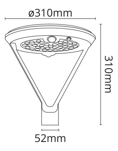 ** Caratteristiche Generali ** Tempo di vita L70B50: 20000h Numero cicli di accensione: 15000 cicli Rischio fotobiologico: Esente ** Caratteristiche di Illuminazione ** Colore: Bianco caldo Flusso: 2000lm CRI: 80 Angolo di emissione: 120° ** Caratteristiche Elettriche ** Potenza: 20W Dimmerabile: no ** Caratteristiche Sorgente Luminosa ** Temp. Colore: 3000K ** Caratteristiche Meccaniche ** Altezza: 310mm Diametro: ø310mm Grado di protezione: IP54 Materiale corpo: Alluminio verniciato Colore corpo: Grigio antracite Tipo Controllo: Sensore PIR Orientabile: no ** Caratteristiche Termiche ** Temp. di funzionamento: -10 / 40°C ** Caratteristiche Batteria ** Pacco batteria incluso: Li-Ion 18650 8000mAh Durata: 6h (100% luminosità), 10h (30% luminosità) Tempo di ricarica: 8h ** Caratteristiche Pannello solare ** Potenza: 6,5W Tensione Voc: 5,5V ** Caratteristiche PIR ** Angolo: 120°+120° Area di rilevamento: 7m Altezza di installazione: Max 2,7m ** Modalità di funzionamento ** Modalità 1: premere il pulsante una prima volta. Il lampione si accende e lampeggia una volta. 5% di luminosità, quando rileva un movimento passa al 100% e 30 secondi dopo l’ultimo rilevamento torna al 5% Modalità 2: Premere il pulsante una seconda volta. Il lampione lampeggia due volte. Spento, quando rileva un movimento passa al 100% della luminosità e 30 secondi dopo l’ultimo rilevamento si spegne. Modalità 3: Premere il pulsante una terza volta. Il lampione lampeggia tre volte. Tempo totale di accensione di 6 ore così suddiviso: 1ah 30% di luminosità, 2a-3ah 24% di luminosità, 4a-5a-6ah 15% di luminosità, poi si spegne ** Contenuto confezione: ** - Lampione; - Chiave a brugola; - Grani di fissaggio - Istruzioni