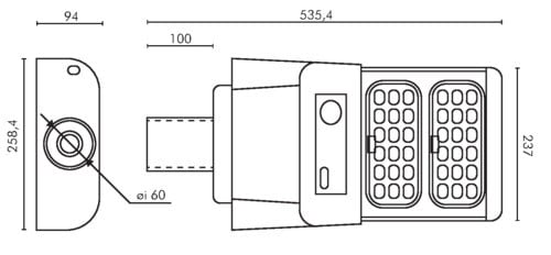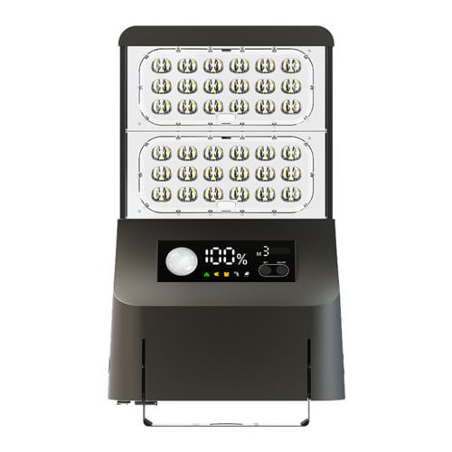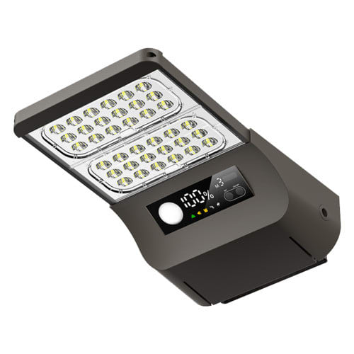 ** Caratteristiche Generali ** Tempo di vita L70B50: 20000h Numero cicli di accensione: 15000 cicli Rischio fotobiologico: Esente ** Caratteristiche di Illuminazione ** Colore: CCT Regolabile Flusso: 6000lm CRI: 80 Angolo di emissione: 120° ** Caratteristiche Elettriche ** Potenza: 60W Dimmerabile: no ** Caratteristiche Sorgente Luminosa ** Temp. Colore: 3000‑6000K ** Caratteristiche Meccaniche ** Lunghezza: 535.4mm Larghezza: 258.4mm Altezza: 94mm Fissaggio: Tramite viti, Staffe Incluse Montaggio: A parete Grado di protezione: IP65 Materiale corpo: Alluminio verniciato Colore corpo: Grigio Tipo Controllo: Sensore PIR Orientabile: no ** Caratteristiche Termiche ** Temp. di funzionamento: -10 / 40°C ** Caratteristiche Batteria ** Pacco batteria incluso: Li-Ion 11,1V 7800mAh Durata: 6h (100% luminosità), 10h (50% luminosità) Tempo di ricarica: 7h ** Caratteristiche Pannello solare ** Potenza: 16W Tensione Voc: 13,2V ** Caratteristiche PIR ** Angolo: 120° Area di rilevamento: 8m Altezza di installazione: Max 4m ** Funzioni aggiuntive ** Sensore di pioggia integrato in grado di cambiare automaticamente la temperatura colore da 6000K a 3000K in caso di pioggia, per migliorare la visibilità. ** Modalità di funzionamento ** M1: ON 30%, quando rileva un movimento 100% dopo 30sec torna in modalità stand-by; M2: ON 30%, quando rileva un movimento 100% dopo 30sec torna in modalità stand-by per 5h successivamente ON 20%, quando rileva un movimento 100% dopo 30sec torna in modalità stand-by; M3: ON 30%, quando rileva un movimento 100% dopo 30sec torna al 30% per 6h, successivamente ON 10% (PIR disabilitato) per 5h e infine ON 30% (PIR disabilitato). ** Contenuto confezione: ** - Lampione; - Telecomando (batterie non incluse); - Kit di fissaggio; - Istruzioni