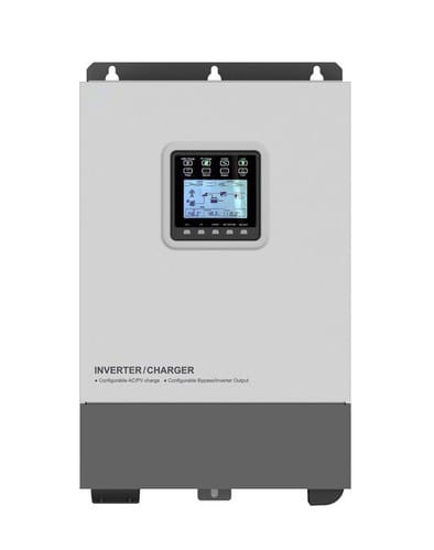Inverter ottimizzato per la gestione di diverse fonti di energia. Regolatore di carica MPPT integrato. Caricabatterie da rete o generatore integrato. Adatto per batterie piombo AGM/GEL e Litio. Con display LCD per la configurazione dei parametri. Supporta Due modalità di funzionamento: con batteria e senza batteria. Tre modalità di carica: solo solare, priorità solare, rete e solare. Due modalità di rete AC: priorità inverter e priorità rete elettrica. ** Caratteristiche Generali ** Tipologia inverter:con cariacabatterie e bypass 230V Modalità funzionamento: Priorità AC (UPS), Priorità DC Raffreddamento: Convezione forzata - ventola automatica Funzioni aggiuntive: Contatto on-off remoto, Porta comunicazione RS485 Interfaccia di controllo: RS485 ** Caratteristiche Inverter ** Forma d'onda in uscita: Sinusoidale pura Frequenza: 50Hz Distorsione d'onda THD: