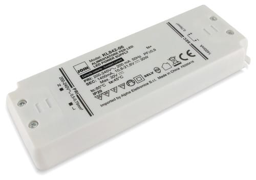 ** Caratteristiche Generali ** Tipo regolazione: CC Classe isolamento: II Correzione PF: Con PFC Dimmerabile: no Grado Protezione: IP20 ** Caratteristiche Elettriche ** Tensione d'ingresso: 200‑240Vac Tolleranza d'ingresso: -10% +6% Frequenza: 50/60Hz Fattore di potenza: >0.9 Potenza: 30W Corrente d'uscita: 1400mA Tensione d'uscita: 10.8 - 21.6V Tensione d'uscita massima: 30V n. led serie: 4-6 Tolleranza tensione d'uscita: ±5% Tolleranza corrente d'uscita: ±5% Protezioni: sovraccarico, sovratemperatura, corto circuito ** Caratteristiche Meccaniche ** Dimensioni (LxWxH): 159 x 59 x 16mm Raffreddamento: passivo Materiale contenitore: Plastico Colore: Bianco Connessioni: morsetti a vite ** Caratteristiche Termiche ** Temperatura di lavoro: -20/45°C Temperatura involucro: 85°C