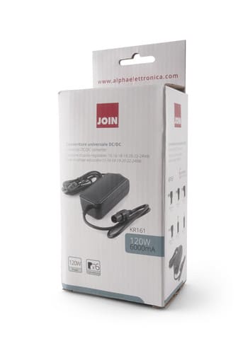 KR161 è un survoltore in grado di elevare la tensione d'ingresso e renderla adatta alla maggior parte dei dispositivi elettronici portatili presenti sul mercato mentre siete in viaggio (aereo e auto). Le tensioni d’uscita sono selezionabili e grazie ai connettori intercambiabili KR161 é adatto alla maggior parte dei computers presenti sul mercato. ** Caratteristiche Generali ** Tecnologia: dc-dc switching non isolato ** Caratteristiche Elettriche ** Tensione d'ingresso: 12‑13.8Vdc Potenza: 120W Corrente d'uscita: 6000mA Tensione d'uscita: 15 - 24V Regolazione di carico: ±5% Tolleranza tensione d'uscita: ±10% Protezioni: corto circuito ** Caratteristiche Meccaniche ** Dimensioni (LxWxH): 115.4 x 52.5 x 36mm Raffreddamento: passivo Materiale contenitore: Plastico Colore: Nero Connettori: 6,5x1,0mm, 5,5x2,5mm, 4,75x1,75mm, 3,5x1,35mm, 5,5x1,75mm, 5,5x2,1mm ** Caratteristiche Termiche ** Temperatura di lavoro: 0/30°C Tensioni di uscita: 15, 16, 18, 19, 20, 22, 24V Corrente d'uscita: max 6A