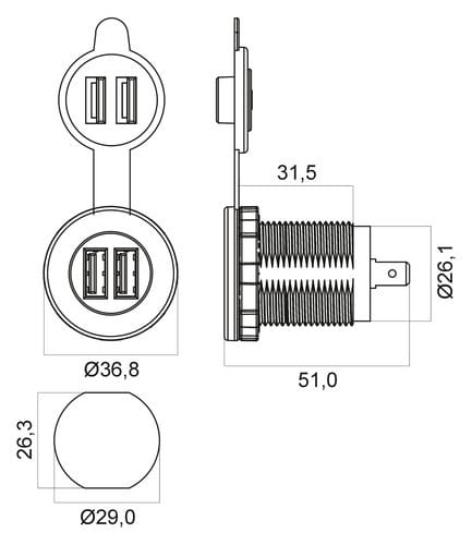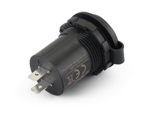 Fissaggio a pannello Indicazione della connessione del carico tramite accensione di LED blue. Connessione con Faston ** Caratteristiche Generali ** Tecnologia: dc-dc switching non isolato Grado Protezione: IP50 ** Caratteristiche Elettriche ** Tensione d'ingresso: 12‑28Vdc Potenza: 10.5W Tensione d'uscita: 5V Corrente d'uscita: 2100mA Tolleranza tensione d'uscita: ±5% Protezioni: corto circuito ** Caratteristiche Meccaniche ** Dimensioni (LxWxH): 51 x 36.8 x 36.8mm Materiale contenitore: Plastico Colore: Nero Connessioni: faston 6,3 Connettori: USB tipo"A" ** Caratteristiche Termiche ** Temperatura di lavoro: 0/40°C