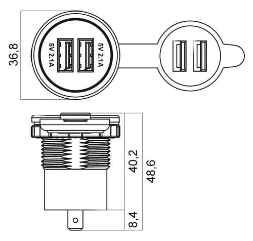 ** Caratteristiche Generali ** Tecnologia: dc-dc switching non isolato Grado Protezione: IP50 ** Caratteristiche Elettriche ** Tensione d'ingresso: 12‑28Vdc Potenza: 21W Tensione d'uscita: 5V Corrente d'uscita: 4200mA Tolleranza tensione d'uscita: ±5% Protezioni: corto circuito ** Caratteristiche Meccaniche ** Dimensioni (LxWxH): 36.8 x 36.8 x 48.6mm Materiale contenitore: Plastico Colore: Nero Connessioni: faston 6,3 Connettori: USB tipo"A" ** Caratteristiche Termiche ** Temperatura di lavoro:0/40°C ** Anello luminoso: ** Blu