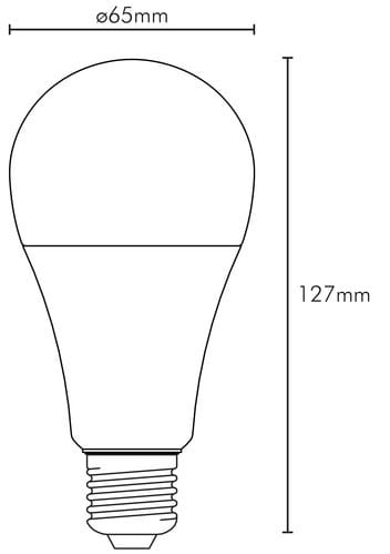 ** Caratteristiche Generali ** Tipo lampada: Bulbo Tempo di vita L70B50: 15000h Numero cicli di accensione: 10000 cicli Fattore di sopravvivenza: 0.9 Rischio fotobiologico: Esente ** Caratteristiche di Illuminazione ** Colore: Bianco naturale Flusso: 1550lm CRI: 80 Starting time: 0.2s Fattore mantenimento flusso: 0.96 Uniformità colore (SDCM): 6 ** Caratteristiche Elettriche ** Classe energetica: F Potenza: 15W Fattore di sfasamento DF: 0.7 Tens. funzionamento AC: 230Vac Tolleranza d'ingresso: ±10% Frequenza: 50-60Hz Dimmerabile: no ** Caratteristiche Sorgente Luminosa ** Temp. Colore: 4000K ** Caratteristiche Meccaniche ** Attacco: E27 Lunghezza: 65mm Larghezza: 65mm Altezza: 127mm Diametro: ø65mm Colore corpo: Bianco Diffusore: Policarbonato opaco ** Caratteristiche Termiche ** Temp. di funzionamento: -10 / 40°C