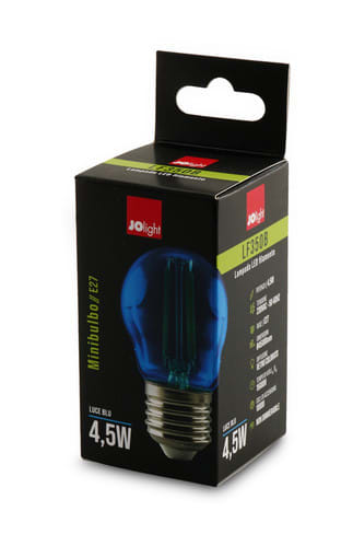 ** Caratteristiche Generali ** Tipo lampada: Mini-Bulbo Numero cicli di accensione: 10000 cicli Tipo di led: Filamento Rischio fotobiologico: Esente ** Caratteristiche di Illuminazione ** Colore: Blu CRI: 80 Starting time: 0.2s ** Caratteristiche Elettriche ** Classe energetica: G Potenza: 4.5W Tens. funzionamento AC: 230Vac Tolleranza d'ingresso: ±10% Frequenza: 50-60Hz Dimmerabile: no ** Caratteristiche Meccaniche ** Attacco: E27 Lunghezza: 45mm Larghezza: 45mm Altezza: 80mm Diametro: ø45mm Diffusore: Vetro colorato ** Caratteristiche Termiche ** Temp. di funzionamento: -10 / 40°C