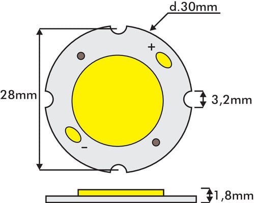 ** Caratteristiche Generali ** Tipo di led: COB ** Caratteristiche di Illuminazione ** Colore: Bianco naturale Flusso: 3600lm CRI: 80 Angolo di emissione: 120° ** Caratteristiche Elettriche ** Potenza: 40W Corrente ingresso max: 1400mA Tens. funzionamento DC: 32Vdc (31‑34Vdc) ** Caratteristiche Sorgente Luminosa ** Temp. Colore: 4000K ** Caratteristiche Meccaniche ** Diametro: ø30mm ** Caratteristiche Termiche ** Temp. di funzionamento: -10 / 70°C PAD Termico consigliato: LL3003-PAD ** Attenzione ** Alimentare solo a corrente limitata. Utilizzare un dissipatore adeguato. ** Alimentatori consigliati: ** Per 1 led: KL844-08
