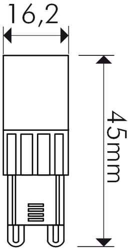 ** Caratteristiche Generali ** Tempo di vita L70B50: 20000h Fattore di sopravvivenza: 0.9 Numero Led: 33 Rischio fotobiologico: Esente ** Caratteristiche di Illuminazione ** Colore: Bianco caldo Flusso: 390lm CRI: 80 Starting time: 0.1s Fattore mantenimento flusso: 0.96 Uniformità colore (SDCM): 6 ** Caratteristiche Elettriche ** Classe energetica: E Potenza: 3.5W Tens. funzionamento AC: 230Vac Frequenza: 50Hz Dimmerabile: no ** Caratteristiche Sorgente Luminosa ** Temp. Colore: 3000K ** Caratteristiche Meccaniche ** Attacco: G9 Lunghezza: 16mm Larghezza: 16mm Altezza: 45mm Diametro: ø16.2mm Diffusore: Plastica ** Caratteristiche Termiche ** Temp. di funzionamento: -10 / 40°C