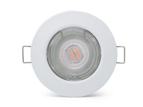 Caratteristiche Porta lampada professionale in metallo adatto per installazioni da incasso. Fissaggio lampada tramite molletta. Adatto per uso interno. ** Caratteristiche Elettriche ** Potenza max installabile: 50W ** Caratteristiche Meccaniche ** Altezza: 28mm Diametro: ø81mm Foro incasso: ø65mm Materiale corpo: Acciaio Colore corpo: Bianco Finitura: Lucida Orientabile: no