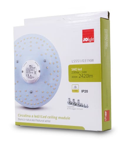 Circolina led con alimentatore incluso. ** Caratteristiche Generali ** Tempo di vita L70B50: 20000h Numero cicli di accensione: 10000 cicli Fattore di sopravvivenza: 0.9 Tipo di led: smd 2835 Numero Led: 100 Rischio fotobiologico: Esente ** Caratteristiche di Illuminazione ** Colore: Bianco naturale Flusso: 2250lm CRI: 80 Angolo di emissione: 120° Warm-up (60%): 0.2s Fattore mantenimento flusso: 0.96 Uniformità colore (SDCM): 6 ** Caratteristiche Elettriche ** Classe energetica: E Potenza: 20W Fattoredi potenza PF: 0.55 Fattore di sfasamento DF: 0.7 Tens. funzionamento AC: 230Vac Tolleranza d'ingresso: ±10% Frequenza: 50-60Hz Dimmerabile: no Classe isolamento: II Alimentatore: Esterno (incluso) ** Caratteristiche Sorgente Luminosa ** Temp. Colore: 4000K ** Caratteristiche Meccaniche ** Attacco: Cavetto Lunghezza: 35mm Larghezza: 180mm Altezza: 180mm Diametro: ø180mm Grado di protezione: IP20 Diffusore: Nessuno ** Caratteristiche Termiche ** Temp. di funzionamento: -10 / 40°C Contenuto Confezione - Modulo led - n3 calamite di fissaggio