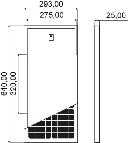 ** Caratteristiche Elettriche ** Potenza: 27Wp Tensione Voc: 19.27V Corrente Isc: 1.71A Tensione operativa (Vmp): 16.67V Corrente operativa (Imp): 1.62A Tensione massima di sistema: 400V Massimo valore fusibile: 5A ** Caratteristiche meccaniche ** Tipo pannello: con cornice Cornice: alluminio anodizzato Parte frontale: vetro Spessore vetro: 2.5mm Incapsulamento: EVA Lato posteriore: TPT Scatola di giunzione: IP65 Larghezza: 293mm Lunghezza: 640mm Spessore: 25mm Peso: 1.95Kg Capacità di carico: 5400Pa Diametro di resistenza: 80Km/h: 25mm ** Caratteristiche Celle ** Tipo cella: Mono Numero di celle: 30 Dimensioni cella: 83 x 55mm ** Caratteristiche temperatura ** Temp. nom. operativa (NMOT): 45°C Coeff. temp. Pmax: -0.35%/°C Coeff. temp. Voc: 0.28%/°C Coeff. temp. Isc: 0.04%/°C Temp. di funzionamento: -40 / 85°C