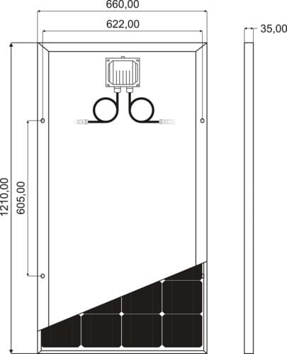 ** Caratteristiche Elettriche ** Potenza: 160Wp Tensione Voc: 21.76V Corrente Isc: 9.23A Tensione operativa (Vmp): 18.37V Corrente operativa (Imp): 8.71A Tensione massima di sistema: 800V Massimo valore fusibile: 15A ** Caratteristiche meccaniche ** Tipo pannello: con cornice Cornice: alluminio anodizzato Parte frontale: vetro Spessore vetro: 2.5mm Incapsulamento: EVA Lato posteriore: TPT Scatola di giunzione: IP65 Larghezza: 660mm Lunghezza: 1210mm Spessore: 35mm Peso: 7.5Kg Capacità di carico: 5400Pa Diametro di resistenza: 80Km/h: 25mm Lunghezza cavi: 90cm Sezione cavi: 2.5mm² Connettori: inclusi e assemblati Cavo: 90cm ø2.5mm² Conn. inclusi e assemblati ** Caratteristiche Celle ** Tipo cella: Mono Numero di celle: 33 Dimensioni cella: 210 x 105mm ** Caratteristiche temperatura ** Temp. nom. operativa (NMOT): 45°C Coeff. temp. Pmax: -0.35%/°C Coeff. temp. Voc: 0.28%/°C Coeff. temp. Isc: 0.04%/°C Temp. di funzionamento: -40 / 85°C
