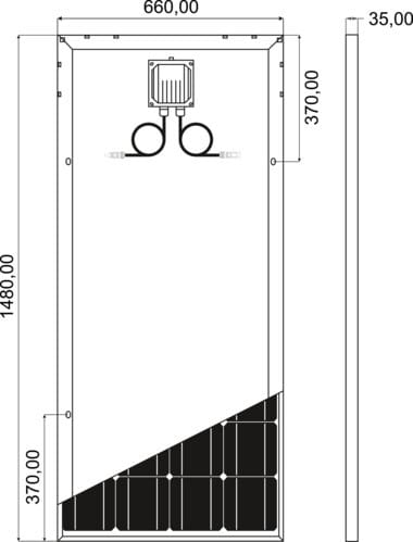 ** Caratteristiche Elettriche ** Potenza: 195Wp Tensione Voc: 25.09V Corrente Isc: 9.36A Tensione operativa (Vmp): 22.04V Corrente operativa (Imp): 8.85A Tensione massima di sistema: 800V Massimo valore fusibile: 15A ** Caratteristiche meccaniche ** Tipo pannello: con cornice Cornice: alluminio anodizzato Parte frontale: vetro Spessore vetro: 2.5mm Incapsulamento: EVA Lato posteriore: TPT Scatola di giunzione: IP65 Larghezza: 660mm Lunghezza: 1480mm Spessore: 35mm Peso: 9.5Kg Capacità di carico: 5400Pa Diametro di resistenza: 80Km/h: 25mm Lunghezza cavi: 90cm Sezione cavi: 2.5mm² Connettori: inclusi e assemblati Cavo: 90cm ø2.5mm² Conn. inclusi e assemblati ** Caratteristiche Celle ** Tipo cella: Mono Numero di celle: 36 Dimensioni cella: 210 x 105mm ** Caratteristiche temperatura ** Temp. nom. operativa (NMOT): 45°C Coeff. temp. Pmax: -0.35%/°C Coeff. temp. Voc: 0.28%/°C Coeff. temp. Isc: 0.04%/°C Temp. di funzionamento: -40 / 85°C