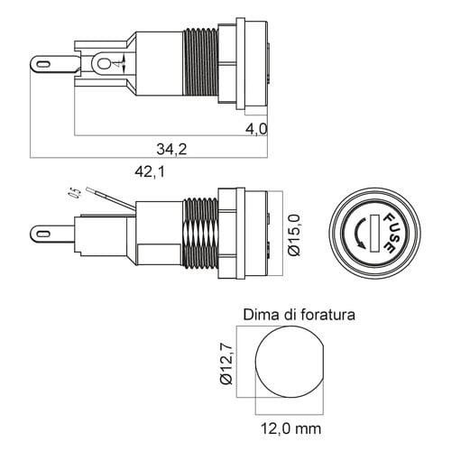 ** Caratteristiche Generali ** Per fusibili: 5x20 Tensione massima: 250V Corrente: 10A ** Caratteristiche Meccaniche ** Corpo: Termoplastico autoestinguente UL94V1 Terminali: Rame stagnato ** Caratteristiche ** Porta fusibile per protezione da sovraccarico. ** Dati Elettrici(23°C) ** Tensione: 250V AC Corrente max: 10A Temperatura operativa: -20°C ~ +85°C Chiusura: Baionetta con chiusura ad avvitare Spessore pannello: 4,5mm max Forza dielettrico: 1500VAC 1 minuto Resistenza isolamento: DC 500V 100MΩmin Metodo saldatura: manuale (350°C± 5°C,3±0.5s) Materiale: Contenitore: PBT, UL 94V0 Baionetta: PBT, UL 94V0 Terminale: Ottone, ossido argento Dado: PBT, UL 94V0