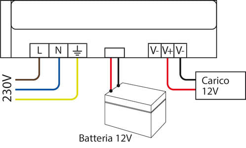 Il PUC048-03 è un alimentatore switching da quadro elettrico per applicazioni TVCC e sicurezza. Questo alimentatore, oltre a fornire un uscita stabilizzata, integra una funzione di caricabatterie. E’ quindi possibile collegare contemporaneamente in uscita il carico e una batteria al piombo 12V. In caso di assenza della tensione di rete 230Vac, l'alimentatore PUC provvederà ad alimentare il carico dalla batteria tampone in modo da garantire continuità di funzionamento del carico stesso. ** Ingresso ** Tensione di ingresso: 230Vac 50Hz Corrente di ingresso: 0,6A ** Uscita ** Tensione di uscita: 13-14,5V Corrente nominale: 3A ** Sezione caricabatterie ** Tensione caricabatterie: 13-14,5V Corrente di carica: 600mA ** Protezioni ** - inversione batteria -sovraccarico - cortocircuito - Disconnessione del carico per tensione batteria bassa (LVD 10Vdc) ** Note ** In caso di assenza rete la tensione di uscita è data dalla Vbatt - 0,6V. Utilizzare solo con una batteria al piombo 12V. Collegare la batteria aimorestti faston. Non collegare la batteria ai morsetti V+ e V-. ** Caratteristiche Generali ** Tecnologia: switching Costruzione: da quadro Tipo regolazione: CV Classe isolamento: I Grado Protezione: IP20 ** Caratteristiche Elettriche ** Regolazione uscita: trimmer Tensione d'ingresso: 230Vac Tolleranza d'ingresso: ±10% Frequenza: 50Hz Potenza: 41.4W Tensione d'uscita: 13.8V Corrente d'uscita: 3000mA Tensione d'uscita: 13 - 14.5V Regolazione di carico: ±5% Regolazione di linea: ±3% Tolleranza corrente d'uscita: ±5% Ripple: