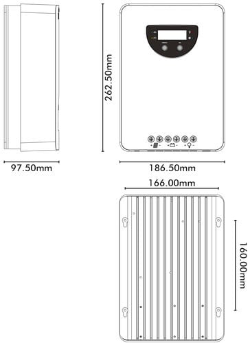 ** Caratteristiche generali ** Regolatore di carica ad alta efficienza per impianti fotovoltaici ad isola. - Inseguimento del punto di massima potenza dei pannelli (MPPT). - Algoritmo di scansione automatica dei punti di massima potenza. - Adatto per moduli mono, poli cristallini e moduli a film sottile. - Supporta la ricarica di batterie piombo e litio. - Algoritmo di carica della batteria a 3 stadi. ** Ingresso batteria ** Tensione massima: 35V Tipologie batterie: Piombo GEL, Piombo AGM, Piombo liquido, Litio (default Gel). LVD 12V/24V: 11,2V (regolabile da 10,8V a 11,8V) / 22,4V (regolabile da 21,6V a 23,6V) LVR 12V/24V: 12V (regolabile da 11,4V a 12,8V) / 24V (regolabile da 22,8V a 25,6V) Float Voltage: 13,7V (regolabile da 13V a 14,5V) / 27,4V (regolabile da 26V a 39V) ** Ingresso pannelli ** Soglia giorno/notte: 8V (regolabile da 3V a 10V) / 16V (regolabile da 6V a 20V) ** Uscita carico ** Corrente: 30A Modalità: Sempre acceso, Dall'alba al tramonto, Dall'alba con timer, Manuale ** Parametri di sistema ** Autoconsumo: 12mA Terminali: 16mm² - 6AWG Grado di protezione: IP20 ** Caratteristiche Generali ** Tensione di Sistema Nominale: 12V, 24V Corrente di ricarica max: 60A Tensione massima pannelli: 100Vdc Tensione batteria max: 35Vdc Potenza massima pannelli (batt. 12V): 750W Potenza massima pannelli (batt. 24V): 1500W Collegamento interno: Negativo comune Compensazione di temperatura: Si Comunicazione: Modbus su RS485 Display Interno: Indicatori Led, Display LCD Display Remoto: No Parametri configurabili: Tensione di riaggancio carico ** Caratteristiche Meccaniche ** Peso: 2.5kg Materiale contenitore: Plastico Grado di protezione: IP20 ** ATTENZIONE ** - Collegare solo ed esclusivamente pannelli fotovoltaici all'ingresso PV. Non collegare unalimentatore o caricabatterie. - Non collegare inverter DC-AC all'uscita Load.