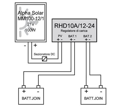 ** Caratteristiche generali ** Regolatore di carica con gestione di due batterie. Due connesioni per due batterie. Nessuna connessione di carico "Load". Indicazione delle impostazioni dell'impianto tramite LCD remoto (non incluso). Modalità di carica PWM(modalità larghezza d'impulso). Selezione del tipo di batteria tramite pulsante e indicazione led. Visualizzazione stato di carica della batteria. Selezione priorità di ricarica delle batterie, è cioè possibile selezionare la percentuale di carica da trasferire sulla batteria 1, il regolatore caricherà la batteria 2 con la percentuale di carica rimanente. Compensazione in temperatura della carica. Il display remoto opzionale RHD-REM1 consente di visualizzare la carica, lo stato e le eventuali anomalie dientrambe le batterie. Si consiglia l'utilizzo di pannelli specifici per applicazioni ad isola a bassa tensione. Collegamento interno con negativo comune. ** Caratteristiche Generali ** Tensione di Sistema Nominale: 12V, 24V Corrente di ricarica max: 10A Tensione massima pannelli: 43Vdc Potenza massima pannelli (batt. 12V): 120W Potenza massima pannelli (batt. 24V): 240W Collegamento interno: Positivo comune Display Interno: Display LED 7 segmenti, Indicatori Led Parametri configurabili: Percentuale di carica batteria principale, Percentuale di carica batteria secondaria ** Caratteristiche Meccaniche ** Materiale contenitore: Plastico Grado di protezione: IP20