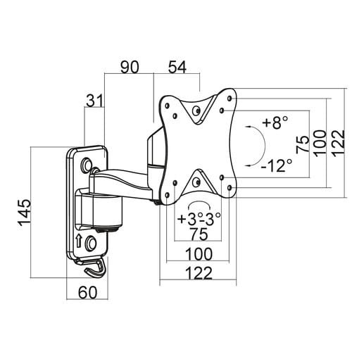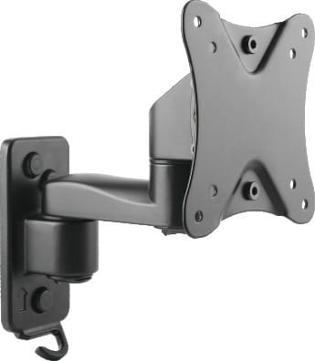Possibile rimuovere i bracci e scegliere la configurazione di installazione. ** Caratteristiche Generali ** Funzionalità: Orientabile Tipologia montaggio: Da parete Adatto per tv da: 13" - 27" Compatibilità VESA Max: 100x100mm Compatibilità VESA: 75x75, 100x100 Estensione: Braccio singolo Rotazione (Pivot): -3° +3° Inclinazione (Tilt): -12° +8° Orientamento (Swivel): -90° +90° Colore: Nero ** Caratteristiche Meccaniche ** Avanzamento TV: Manuale Materiale: Acciaio Distanza dal muro: 17.5cm Portata: 20Kg Bolla di livello: No Sistema di bloccaggio: No Gestione cavi: Si Innesto a baionetta: Si Kit di montaggio: Incluso