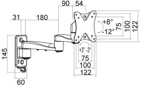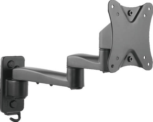 Possibile rimuovere i bracci e scegliere la configurazione di installazione. ** Caratteristiche Generali ** Funzionalità: Orientabile Tipologia montaggio: Da parete Adatto per tv da: 13" - 27" Compatibilità VESA Max: 100x100mm Compatibilità VESA: 75x75, 100x100 Estensione: Braccio doppio Rotazione (Pivot): -3° +3° Inclinazione (Tilt): -12° +8° Orientamento (Swivel): -90° +90° Colore: Nero ** Caratteristiche Meccaniche ** Avanzamento TV: Manuale Materiale: Acciaio Distanza dal muro: 35.5cm Portata: 20Kg Bolla di livello: No Sistema di bloccaggio: No Gestione cavi: Si Innesto a baionetta: Si Kit di montaggio: Incluso