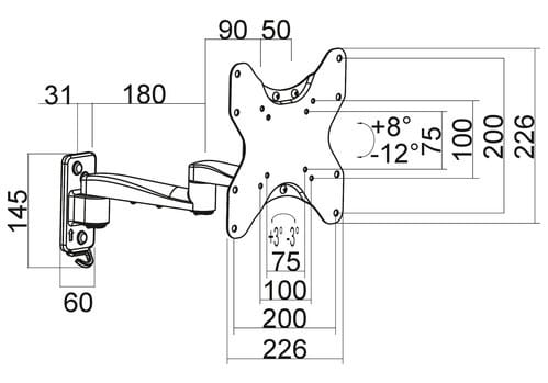 Possibile rimuovere i bracci e scegliere la configurazione di installazione. ** Caratteristiche Generali ** Funzionalità: Orientabile Tipologia montaggio: Da parete Adatto per tv da: 23" - 42" Compatibilità VESA Max: 200x200mm Compatibilità VESA: 75x75, 100x100, 200x100, 200x200 Estensione: Braccio doppio Rotazione (Pivot): -3° +3° Inclinazione (Tilt): -12° +8° Orientamento (Swivel): -90° +90° Colore: Nero ** Caratteristiche Meccaniche ** Avanzamento TV: Manuale Materiale: Acciaio Portata: 20Kg Bolla di livello: No Sistema di bloccaggio: No Gestione cavi: Si Innesto a baionetta: No Kit di montaggio: Incluso