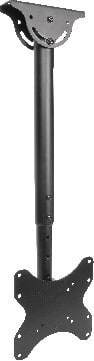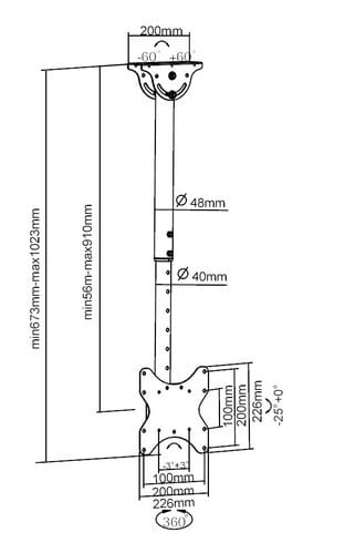 Installabile anche su soffitti inclinati: regolazione +60°-60°. Estensione da 560-910mm ** Caratteristiche Generali ** Funzionalità: Orientabile Tipologia montaggio: Da soffitto Adatto per tv da: 23" - 42" Compatibilità VESA Max: 200x200mm Compatibilità VESA: 100x100, 200x100, 200x200 Estensione: Braccio singolo Rotazione (Pivot): -3° +3° Inclinazione (Tilt): -25° +0° Orientamento (Swivel): 360° Colore: Nero ** Caratteristiche Meccaniche ** Avanzamento TV: Manuale Materiale: Acciaio Distanza dal muro: 91cm Portata: 50Kg Bolla di livello: No Sistema di bloccaggio: No Gestione cavi: Si Innesto a baionetta: No Kit di montaggio: Incluso