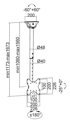 Installabile anche su soffitti inclinati: regolazione +60°-60°. Estensione da 1060-1560mm. ** Caratteristiche Generali ** Funzionalità: Orientabile Tipologia montaggio: Da soffitto Adatto per tv da: 23" - 42" Compatibilità VESA Max: 200x200mm Compatibilità VESA: 100x100, 200x200, 200x100 Estensione: Braccio singolo Rotazione (Pivot): -3° +3° Inclinazione (Tilt): -25° +0° Orientamento (Swivel): -180° +180° Colore: Nero ** Caratteristiche Meccaniche ** Avanzamento TV: Manuale Materiale: Acciaio Distanza dal muro: 156cm Portata: 50Kg Bolla di livello: No Sistema di bloccaggio: No Gestione cavi: Si Innesto a baionetta: No Kit di montaggio: Incluso