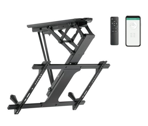 I supporti TV motorizzati da soffitto vengono solitamente scelti dai clienti che preferiscono risparmiare spazio nella stanza che può essere destinato ad altri scopi, senza rinunciare alla comodità di una corretta postazione di visione. Il potente motoredi qualità sostiene TV fino a 70" (35 kg) e abbassa e ritrae i TV in modo fluido e silenzioso, completamente controllabile tramite telecomando o app Tuya. Un meccanismo bilanciato previene qualsiasi vibrazione del soffitto quando la TV è in movimento. Hala funzione di memoria intelligente per andare automaticamente all'angolo impostato, senza la necessità di regolare nuovamente l'angolo ogni volta che viene utilizzato. Questo supporto può essere installato su calcestruzzo. La scelta perfetta per installazioni di visione TV pubbliche o domestiche! - Motore potente: più stabile, forte e durevole - Regolazioni di livellamento: consentono di posizionare perfettamente la TV dopo averla appesa - Telecomando incluso: per facilitare gli spostamenti - Controlloremoto dall'app Tuya - Design ribaltabile: consente un facile stoccaggio, spazio liberato e sicurezza ** Caratteristiche Generali ** Funzionalità: Orientabile, Inclinabile Tipologia montaggio: Da soffitto Adatto per tv da: 32" - 70" Compatibilità VESAMax: 600x400mm Compatibilità VESA: 200x100, 200x200, 300x200, 400x200, 300x300, 400x300, 400x400, 600x400, 200x400 Estensione: Braccio singolo Rotazione (Pivot): -2° +2° Inclinazione (Tilt): 0° +75° Colore: Nero ** Caratteristiche Meccaniche ** Avanzamento TV: Motorizzato Materiale: Acciaio, Plastica Lunghezza braccio piegato: 725mm Distanza dal muro: 10.8cm Portata: 35Kg Bolla di livello: No Sistema di bloccaggio: No Gestione cavi: Si Innesto a baionetta: No Kit di montaggio: Incluso ** Specifiche ** Finitura superficiale: Verniciatura a polvere Colore: Nero opaco Dimensioni: 725x664x516mm Adatto alla TV curva: Sì Tipo pannello: pannello staccabile Tipo di piastra a muro: piastra a muro fissa Movimento TV: fluido (senza scatti) Rumore: