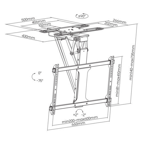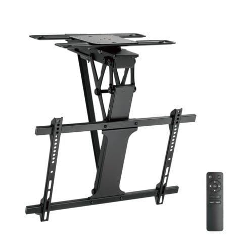 I supporti TV motorizzati da soffitto vengono solitamente scelti dai clienti che preferiscono risparmiare spazio nella stanza che può essere destinato ad altri scopi, senza rinunciare alla comodità di una corretta postazione di visione. Ora, tramite l'app Tuya, i supporti possono ruotare fino a 180° per angoli di visione multipli. Il potente motore di qualità sostiene TV fino a 75" (35 kg) e fornisce la funzione di ribaltamento automatico su e giù con la semplice pressione di un pulsante. Un meccanismo bilanciato previene qualsiasi vibrazione del soffitto quando la TV è in movimento. Il sistema di prevenzione delle collisioni interrompe la rotazione della TV quando sono presenti ostacoli. Ha la funzione di memoria intelligente per andare automaticamente all'angolo impostato, senza la necessità di regolare nuovamente l'angolo ogni volta che viene utilizzato. Questo supporto può essere installato su giunti del soffitto in legno. La scelta perfetta per installazioni di visione TV pubbliche o domestiche! - Capacità di rotazione: per angoli di visione multipli. - Regolazioni di livellamento: consentono di posizionare perfettamente la TV dopo averla appesa - Sistema di prevenzione delle collisioni: protezione contro incidenti e infortuni - Telecomando incluso: per facilitare gli spostamenti - Design ribaltabile: consente un facile stoccaggio, spazio liberato e sicurezza - Motore potente: più stabile, forte e durevole - Controllo remoto dall'app Tuya ** Caratteristiche Generali ** Funzionalità: Orientabile, Inclinabile Tipologia montaggio: Da soffitto Adatto per tv da: 32" - 75" Compatibilità VESA Max: 600x400mm Compatibilità VESA: 200x100, 200x200, 300x200, 400x200, 300x300, 400x300, 400x400, 600x400, 200x400 Estensione: Braccio singolo Rotazione (Pivot): -2° +2° Inclinazione (Tilt): 0° +75° Orientamento (Swivel): -90° +90° Colore: Nero ** Caratteristiche Meccaniche ** Avanzamento TV: Motorizzato Materiale: Acciaio, Plastica Lunghezza braccio piegato: 735mm Distanza dal muro: 14cm Portata: 35Kg Bolladi livello: No Sistema di bloccaggio: No Gestione cavi: Si Innesto a baionetta: No Kit di montaggio: Incluso ** Specifiche ** Finitura superficiale: Verniciatura a polvere Colore: Nero opaco Dimensioni: 735x664x516mm Adatto alla TV curva: Sì Tipo pannello: pannello staccabile Tipo di piastra a muro: piastra a muro fissa Movimento TV: fluido (senza scatti) Rumore: