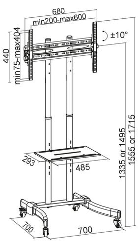 Supporto mobile da pavimento. Supporti telescopici per ridurre agevolare l'imballo. Regolazione in altezza della TV. Inclinazione regolabile. Mensola regolabile in altezza. Base ad H stabile e robusta. ** Caratteristiche Generali ** Tipologia montaggio: Da pavimento Adatto per tv da: 37" - 70" Compatibilità VESA Max: 600x400mm Compatibilità VESA: 200x100, 200x200, 300x200, 300x300, 400x200, 400x300, 400x400, 425x400, 600x400 Estensione: Braccio singolo Rotazione (Pivot): 0° Inclinazione (Tilt): -10° +10° Orientamento (Swivel): 0° Colore: Nero ** Caratteristiche Meccaniche ** Avanzamento TV: Manuale Materiale: Acciaio Portata: 40Kg Bolla di livello: No Sistema di bloccaggio: No Gestione cavi: Si Innesto a baionetta: No Kit di montaggio: Incluso