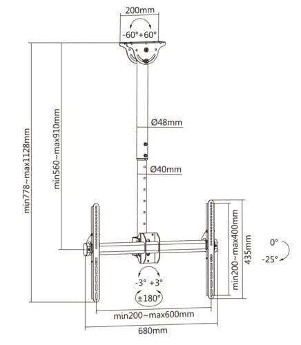 Installabile anche su soffitti inclinati: regolazione +60°-60°. Estensione da 560-910mm. ** Caratteristiche Generali ** Funzionalità: Orientabile Tipologia montaggio: Da soffitto Adatto per tv da: 37" - 70" Compatibilità VESA Max: 600x400mm Compatibilità VESA: 200x200, 300x300, 400x200, 400x400, 600x400 Estensione: Braccio doppio Rotazione (Pivot): -3° +3° Inclinazione (Tilt): -25° +0° Orientamento (Swivel): -180° +180° Colore: Nero ** Caratteristiche Meccaniche ** Avanzamento TV: Manuale Materiale: Acciaio Dimensioni (WxH): 1560mm Distanza dal muro: 156cm Portata: 50Kg Bolla di livello: No Sistema di bloccaggio: No Gestione cavi: Si Innesto a baionetta: No Kit di montaggio: Incluso