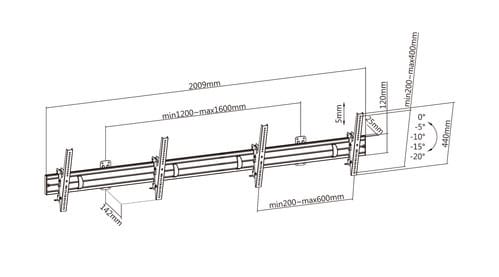 Questo supporto da parete per due display da 45" a 55" consente di creare un pannello menu perfettamente allineato per offrire ai tuoi clienti un'esperienza di visualizzazione coinvolgente e sempre aggiornata. Il sistema di montaggio modulare semplifica la fase di installazione. ** Caratteristiche Generali ** Funzionalità: Inclinabile Tipologia montaggio: Da parete Adatto per tv da: 45" - 55" Compatibilità VESA Max: 600x400mm Compatibilità VESA: 200x200, 400x200, 300x300, 400x400, 600x400 Estensione:Nessuna Colore: Grigio ** Caratteristiche Meccaniche ** Materiale: Alluminio e acciaio Dimensioni (WxH): 2009mm x 440mm Distanza fori: 600x400mm Portata: 50Kg