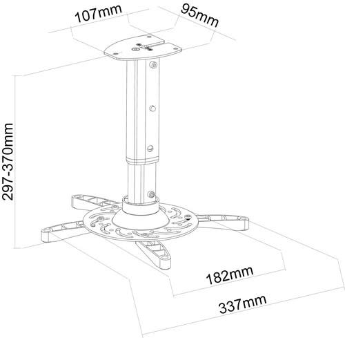 Supporto a soffitto per proiettori. Estensione da 29,7 a 37cm. ** Caratteristiche Generali ** Tipologia montaggio: Da soffitto Rotazione (Pivot): 0° Inclinazione (Tilt): 30° Orientamento (Swivel): 360° Colore: Grigio ** Caratteristiche Meccaniche ** Avanzamento TV: Manuale Materiale: Alluminio e acciaio Dimensioni (WxH): 182mm x 370mm Distanza dal muro: 29.7cm Portata: 15Kg Peso prodotto: 1.8Kg Bolla di livello: No Sistema di bloccaggio: No Gestione cavi: Si Innesto a baionetta: No Kit di montaggio: Incluso