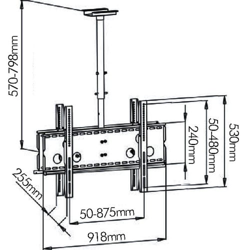 Il supporto consente il montaggio di due monitor TV. ** Caratteristiche Generali ** Funzionalità: Orientabile Tipologia montaggio: Da soffitto Adatto per tv da: 32" - 60" Compatibilità VESA Max: 450x750mm Compatibilità VESA: 50x50, 75x75, 100x100, 100x150, 100x200, 150x100, 150x150, 200x100, 200x200, 300x200, 300x300, 400x200, 400x300, 400x400, 425x400, 450x750 Estensione: Braccio singolo Rotazione (Pivot): 0° Inclinazione (Tilt): -15° +0° Orientamento (Swivel): 360° Colore: Nero ** Caratteristiche Meccaniche ** Avanzamento TV: Manuale Materiale: Acciaio Dimensioni (WxH): 918mm x 530mm Distanza dal muro: 57cm Distanza fori: 770x480mm Portata: 160Kg Peso prodotto: 13Kg Bolla di livello: Si Sistema di bloccaggio: Si Gestione cavi: Si Innesto a baionetta: No Kit di montaggio: Incluso Completo di viti di sicurezza antifurto.
