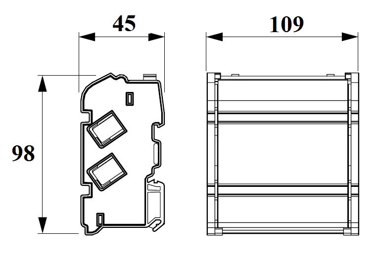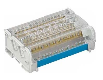 Morsettiere di ripartizione protette. Inserti in Ottone e viti di serraggio in Acciaio Zincato. Supporti in Poliammide e coperchio in policarbonato. Temperatura di esercizio da -5°C a +85°C, resistenza calore +130°C.