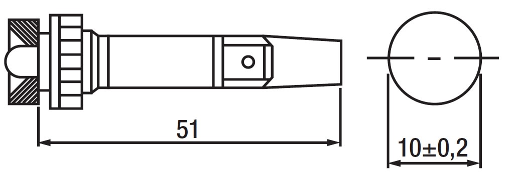 Indicatore luminoso LED • Corpo cilindrico filettato - policarbonato • Ghiera cromata alta Ø 13 mm • Supporto Faston 6,3x0,8mm • Led Ø 10 mm