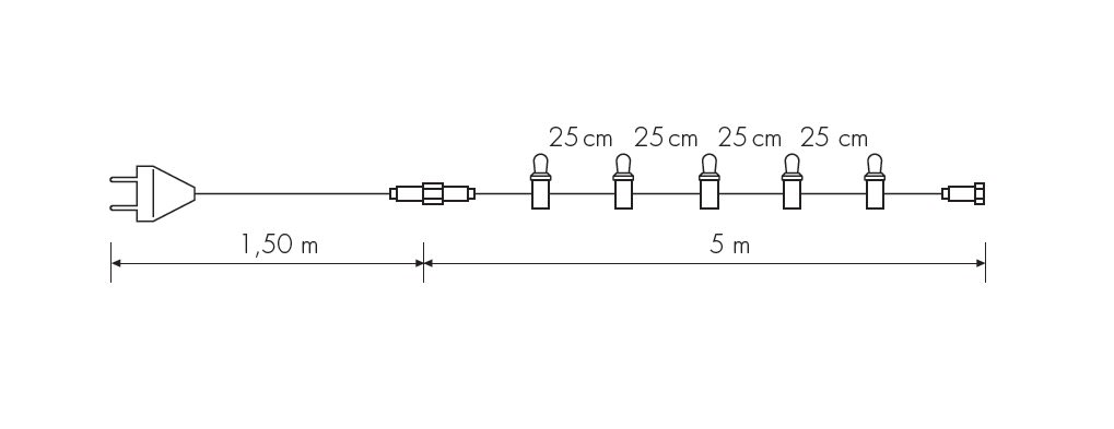 Cordoniera LED prolungabile. In gomma per esterno IP 44 . Consente un notevole risparmio energetico, un’alta resa luminosa, un’elevata prolungabilità ed una lunga durata. Cordoniera composta da: Cavo a 3 fili in gomma L=500 cm, H03RN-F 1x0,75 mm² approvato VDE, con 20 portalampade E 14, con O-Ring di tenuta in gomma; connettore finale femmina per la prolunga. Colore cavo: nero. 20 lampadine 2 LED, ad alta luminosità, E14 - 12V - 0,24W, corpo in policarbonato. Cavo di alimentazione in gomma L=150 cm H05RN-F 2x0,75 mm² - approvato VDE - con spina Schuko stagna IP 44 - VDE, connettore femmina. Colore cavo: nero. Temperatura di esercizio: - 20 °C +50 °C. Colore LED: bianco freddo.