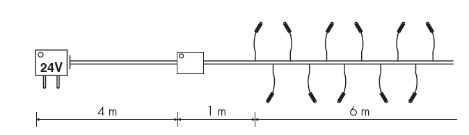 Ghirlanda lineare con 80 led ultra luminosi e con gioco luci, per uso all’esterno ed all’interno. Costruita secondo la norma EN60598-2-20-A2:2004. Gioco luci elettronico stagno 8 effetti. Trasformatore Plug-in IP 44 . Cavo 26AWG verde. I led ultra luminosi consentono: Bassissimi consumi. Alta luminosità. Durata lunghissima. Nessun riscaldamento e quindi grande risparmio energetico. Lunghezza totale: 10m