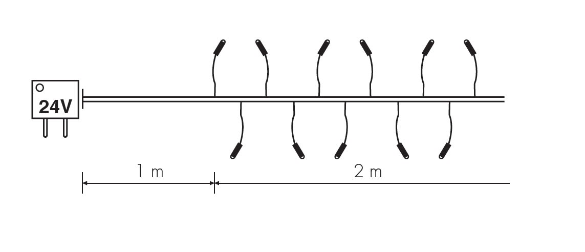 Stringa luminosa con 20 LED ad altissima luminosità, 3mm, a luce fissa, in bassa tensione di sicurezza 24V. Completa di trasformatore a spina 24V - 1,2VA per uso all’esterno. Cavo UL26AWG trasparente, autoestinguente. Ideale per presepi, piccoli alberi ecentro tavola. Colore LED: bianco caldo.